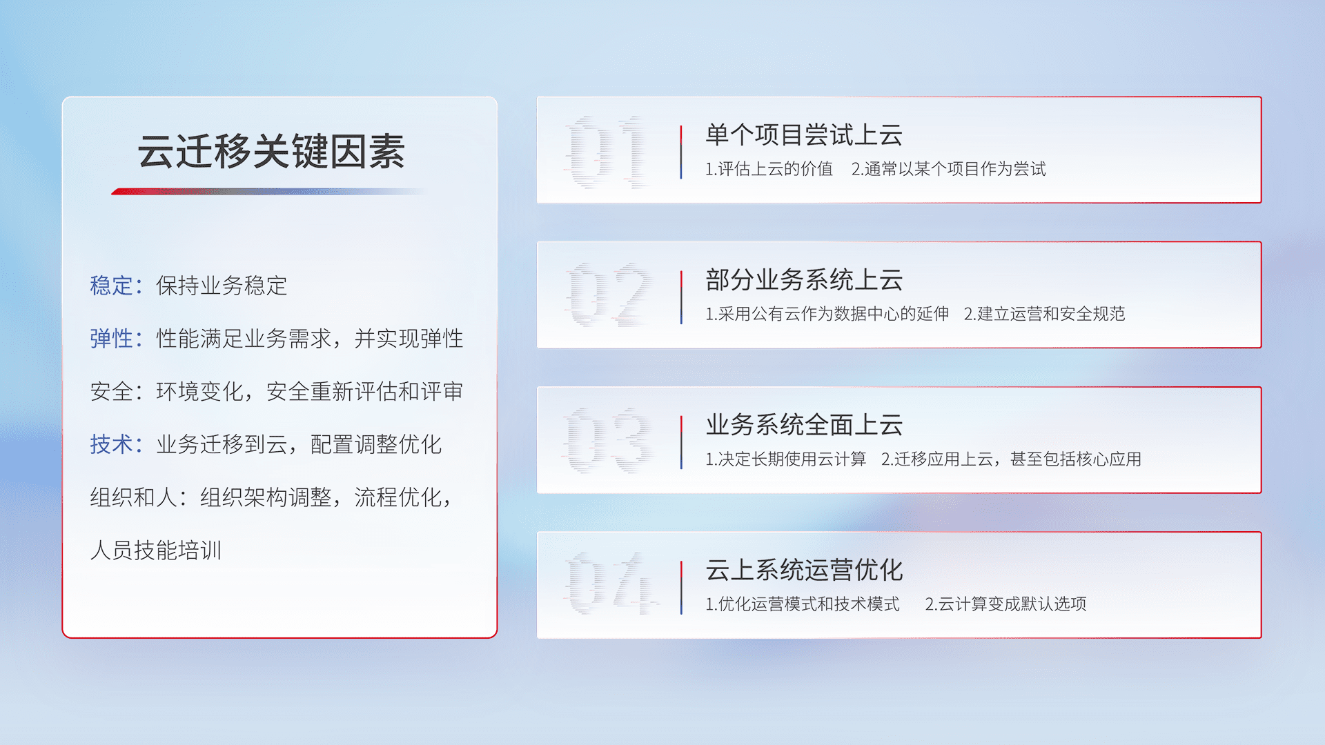 结合实际业务,,,,从规划设计、、、云平台选型、、、云原生改造、、数据迁移、、、集成交付,,,迁移全过程为客户识别最佳上云路径,,,做好风险识别管理,,设计网络架构、、、、身份权限、、安全审计合规、、、操作审计、、、、日志审计、、监控告警策略、、、多站点容灾设计等,,对云上基础设施进行整体规划,,,提升IT治理水平,,以满足弹性、、、、高可用、、、高性能的需求。。。