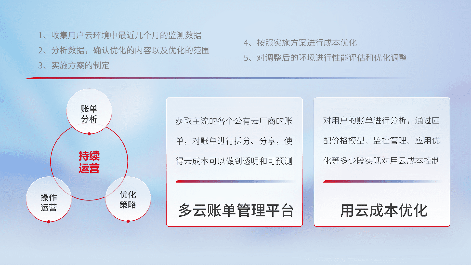 通过多云纳管,,以统一的资源数据模型把客户的云资源进行抽象和封装,,,,进而实现对多云资源的统一操作,,,保障云资源管理的可靠性、、、稳定性与可用性。。量身定制化运维内容,,配置、、开发运维、、、、补丁管理、、、、备份、、、监控、、、、认证和访问管理、、、、审计和日常巡检等,,,,保障在用云过程中的可靠度,,,稳定度以及高可用率。。